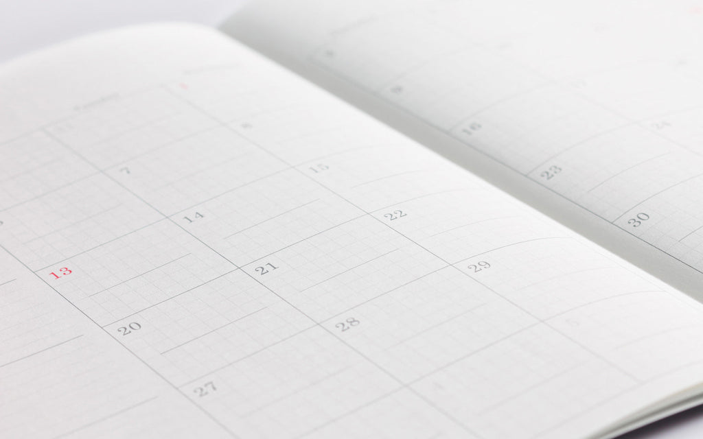 スケジュールを一目で俯瞰できる月間ブロックには、カレンダーを上下に分割するセンターラインを印刷しました。月間ブロックページとフリーページには方眼を印刷しているため筆記やデコレーションのガイドにもなります。